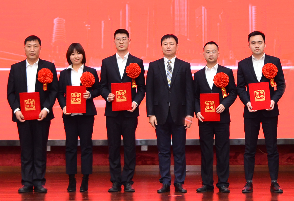 ▲總裁楊應(yīng)群(右三)為21位先進(jìn)個(gè)人頒獎(jiǎng)