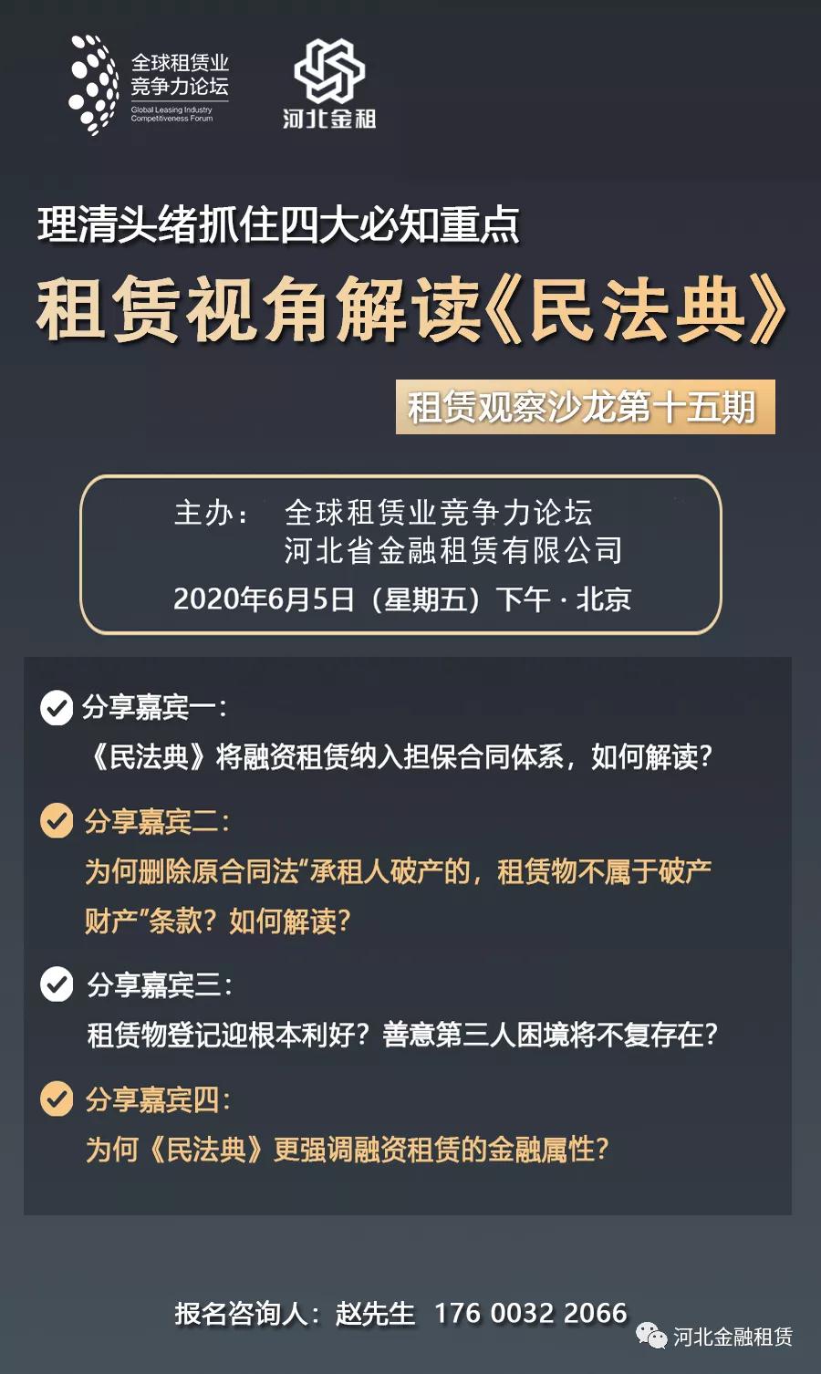 《中華人民共和國民法典》近日正式公布,標(biāo)志我國“民法典時代”到來。《民法典》涉及多項(xiàng)與融資租賃密切相關(guān)的法律條款,擴(kuò)大了動產(chǎn)擔(dān)保合同的范圍,將融資租賃納入擔(dān)保合同,將對融資租賃業(yè)的經(jīng)營活動產(chǎn)生深遠(yuǎn)影響。 6月5日下午,全球…